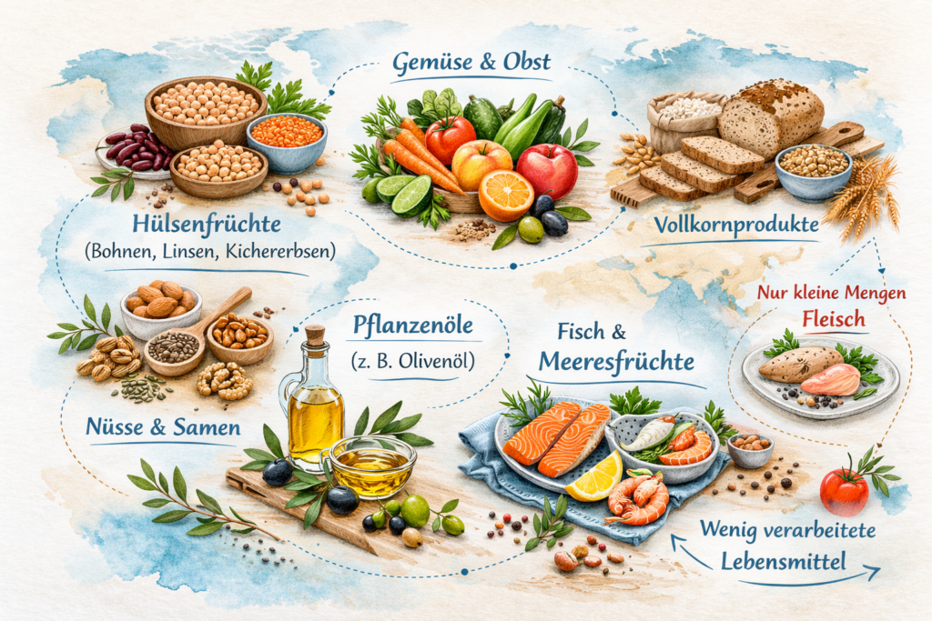 Ein zentraler gemeinsamer Nenner in allen Blue Zones ist eine überwiegend pflanzenbasierte Ernährung, die folgende typische Merkmale aufweist: