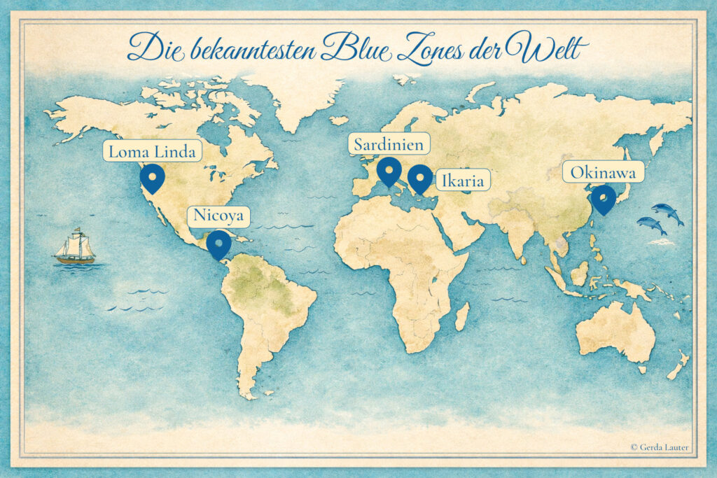 Als Blue Zones werden Regionen der Welt bezeichnet, in denen Menschen besonders häufig ein sehr hohes Alter (90+ oder sogar 100+) erreichen und dabei vergleichsweise gesund bleiben.